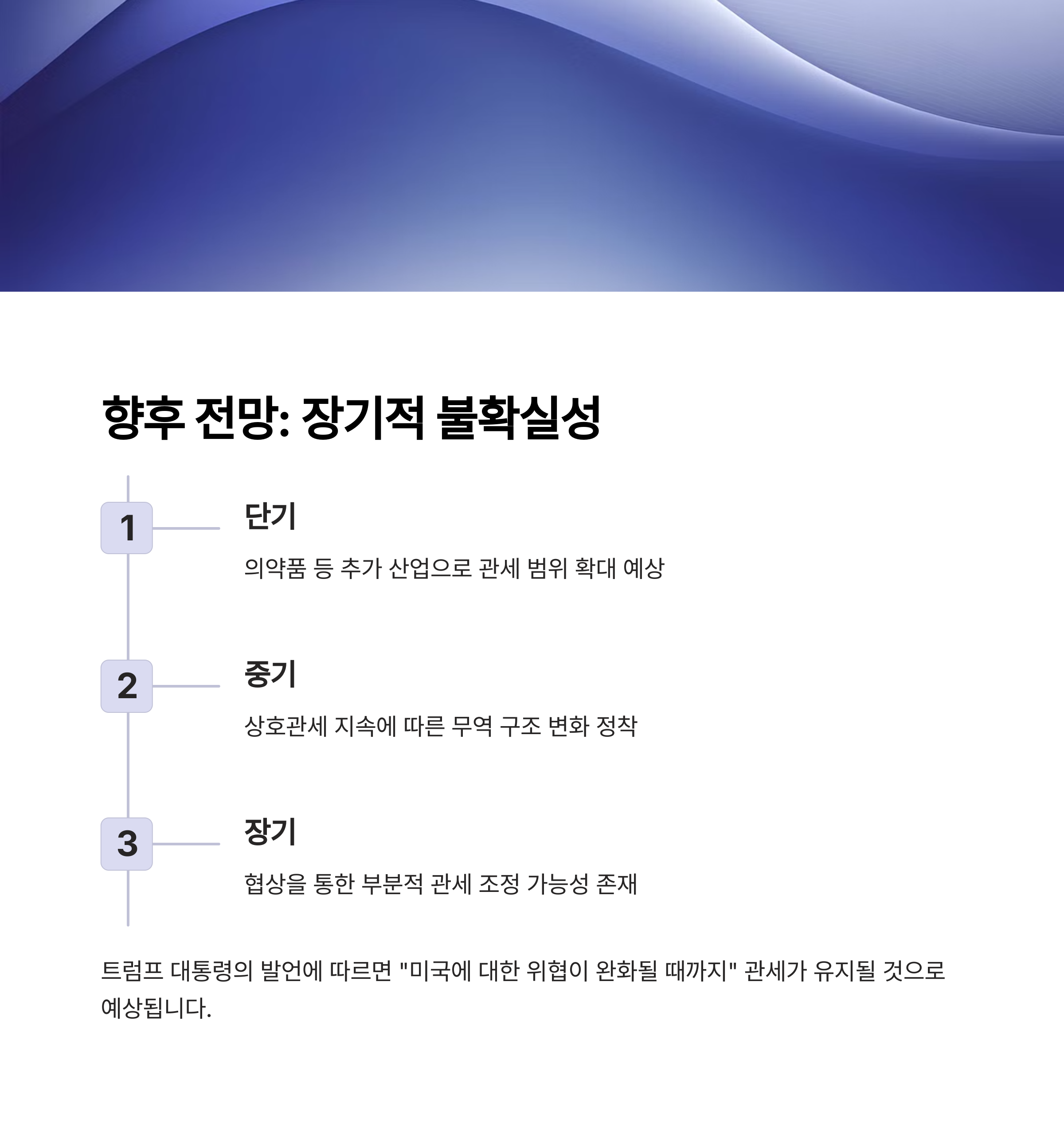 트럼프 대통령은 상호관세가 미국에 대한 위협이 완화될 때까지 유효하다고 밝혔습니다. 이는 장기적으로 관세가 유지될 가능성이 있음을 의미하지만, 동시에 협상을 통한 조정 가능성도 시사합니다.
