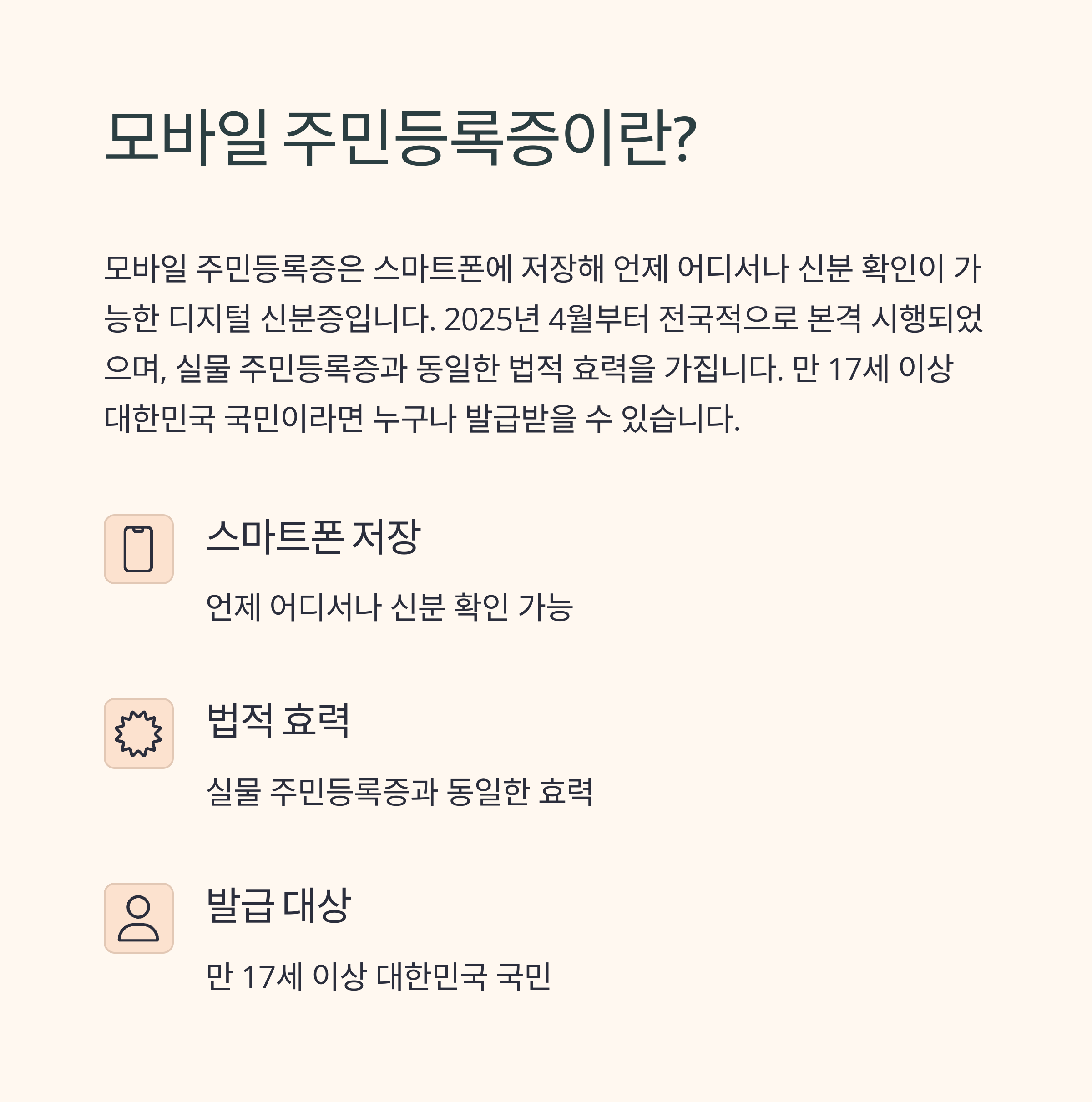 모바일 주민등록증은 스마트폰에 저장해 언제 어디서나 신분 확인이 가능한 디지털 신분증입니다. 실물 주민등록증과 동일한 법적 효력을 가지며, 만 17세 이상 대한민국 국민이라면 누구나 발급받을 수 있습니다.