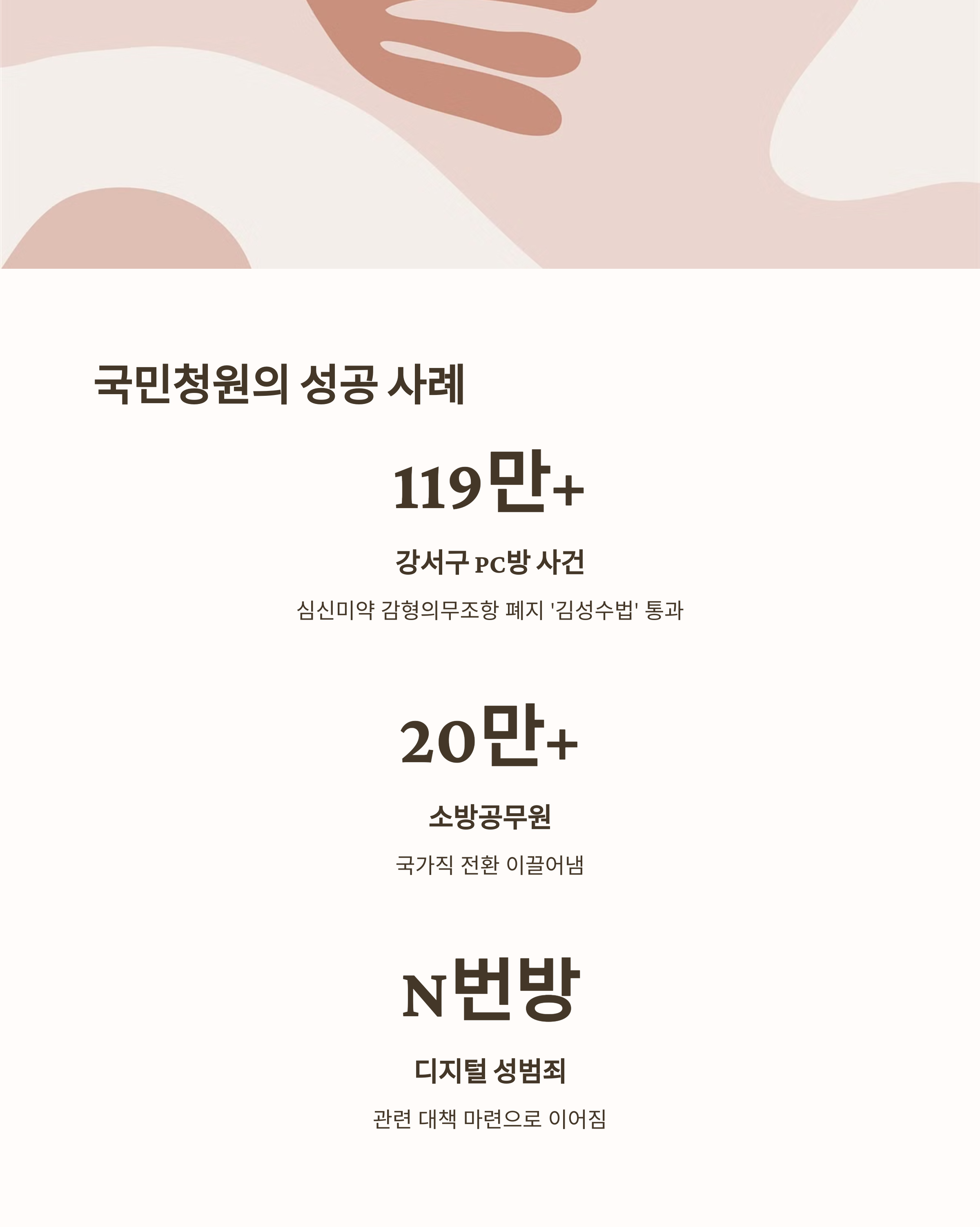 가장 많은 참여인원을 기록한 청원은 2018년 11월 강서구 PC방 살해사건 관련 청원으로, 119만 명이 넘는 참여인원을 기록했습니다. 이 청원은 '심신미약 감형의무조항 폐지' 형법 개정안, 이른바 '김성수법' 통과로 이어져 실질적인 법률 개정의 성과를 이루었습니다. 또한 소방공무원 국가직 전환, '디지털 성범죄' N번방 사건 관련 대책 마련 등 여러 사회적 이슈들이 국민청원을 통해 정부 정책에 영향을 미쳤습니다.