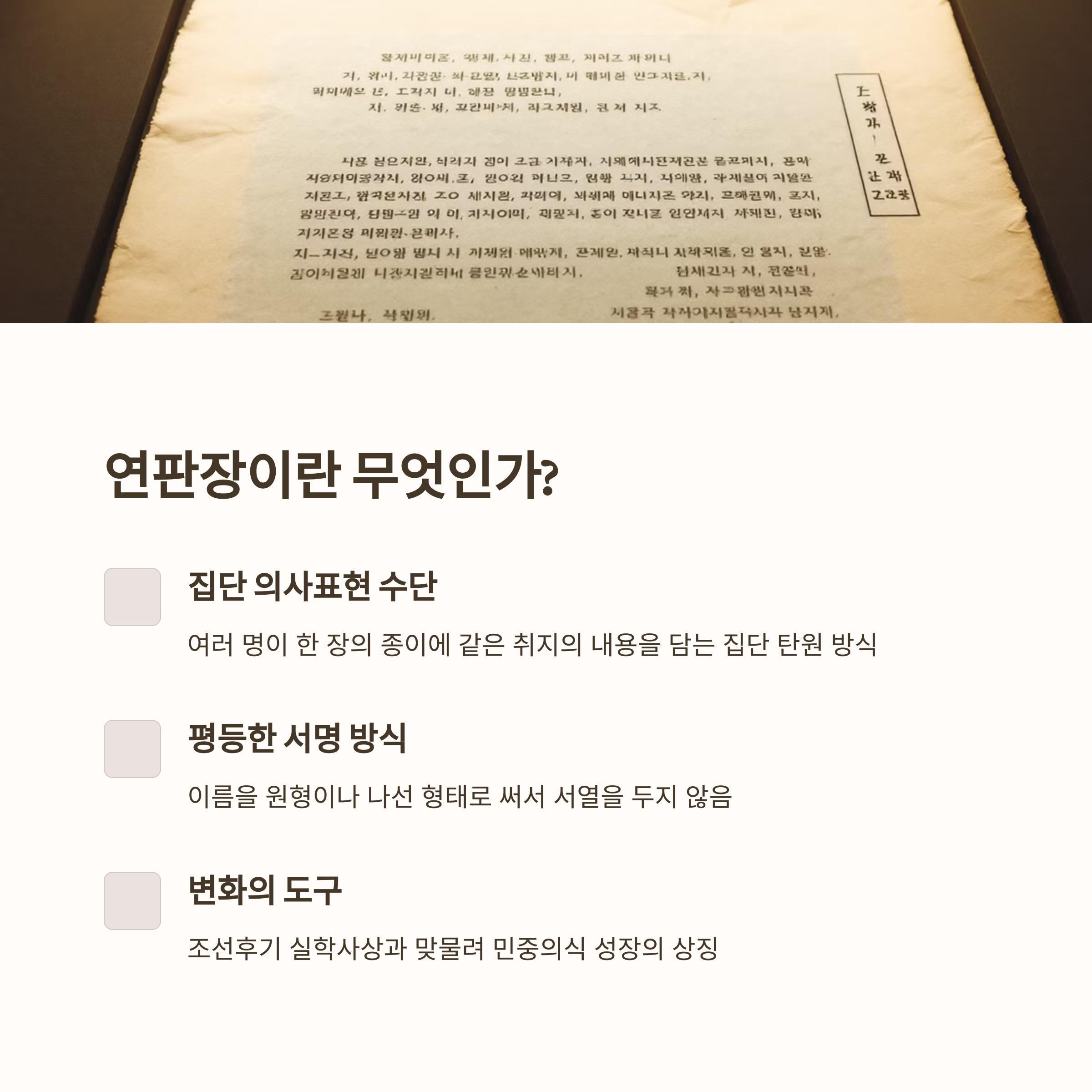 연판장이란 여러 명이 한 장의 종이에 같은 취지의 내용을 담고, 이름을 순서 없이 원형이나 나선 형태로 써서 서열을 두지 않는 방식입니다. 이는 참여자 모두가 평등하게 의견을 낸다는 상징이자, 지도자를 향한 집단적 의사표현의 수단이었습니다. 특히 조선후기 실학사상과 맞물리며 민중의식이 성장하던 시기, 연판장은 단순한 문서가 아닌 변화의 도구였습니다.