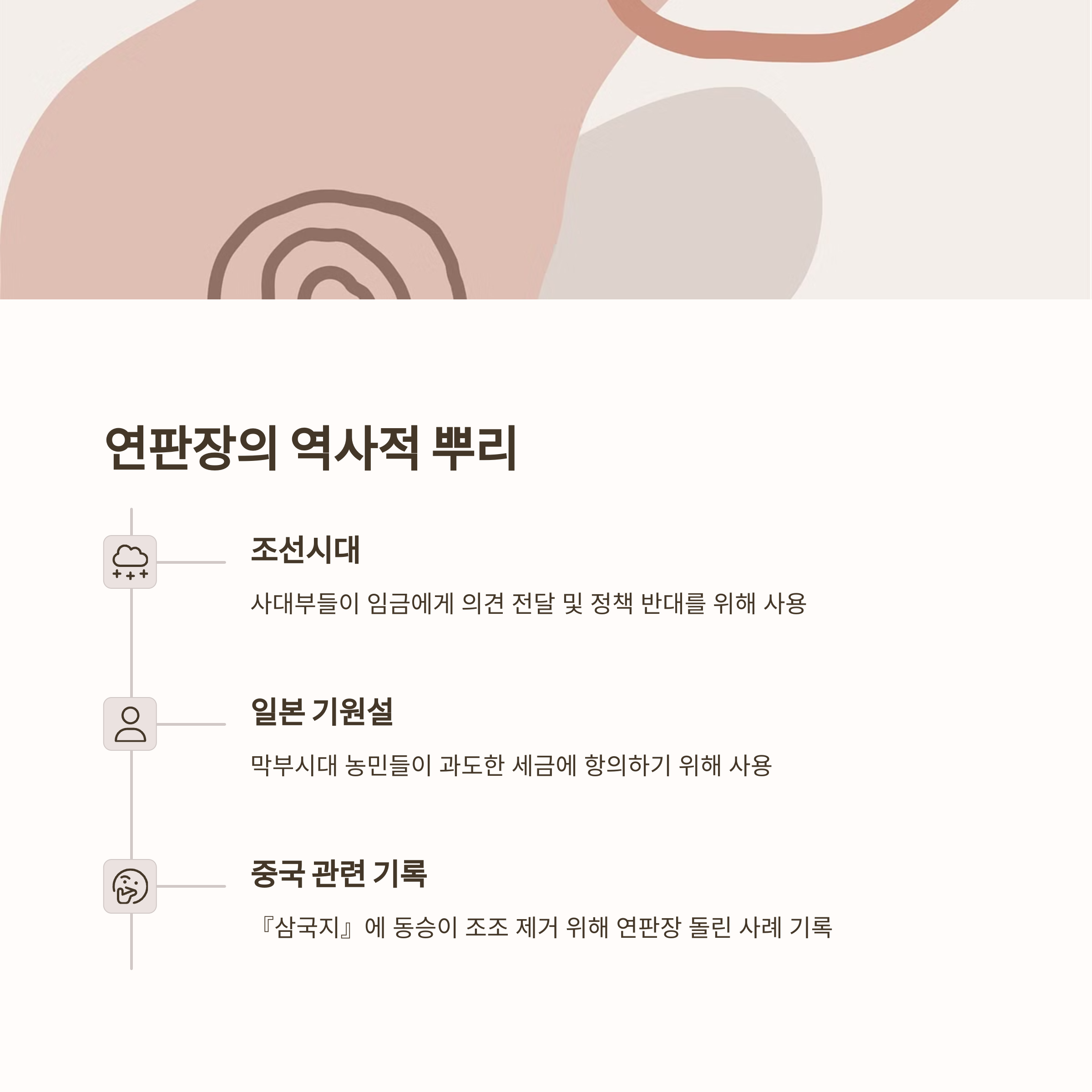 중국관련기록 : 중국 역사에서도 유사한 집단서명 문화가 발견된다는 점입니다. 특히 『삼국지』에서는 후한 황제의 외척인 동승이 조조를 제거하기 위해 연판장을 돌린 사례가 기록되어 있습니다.