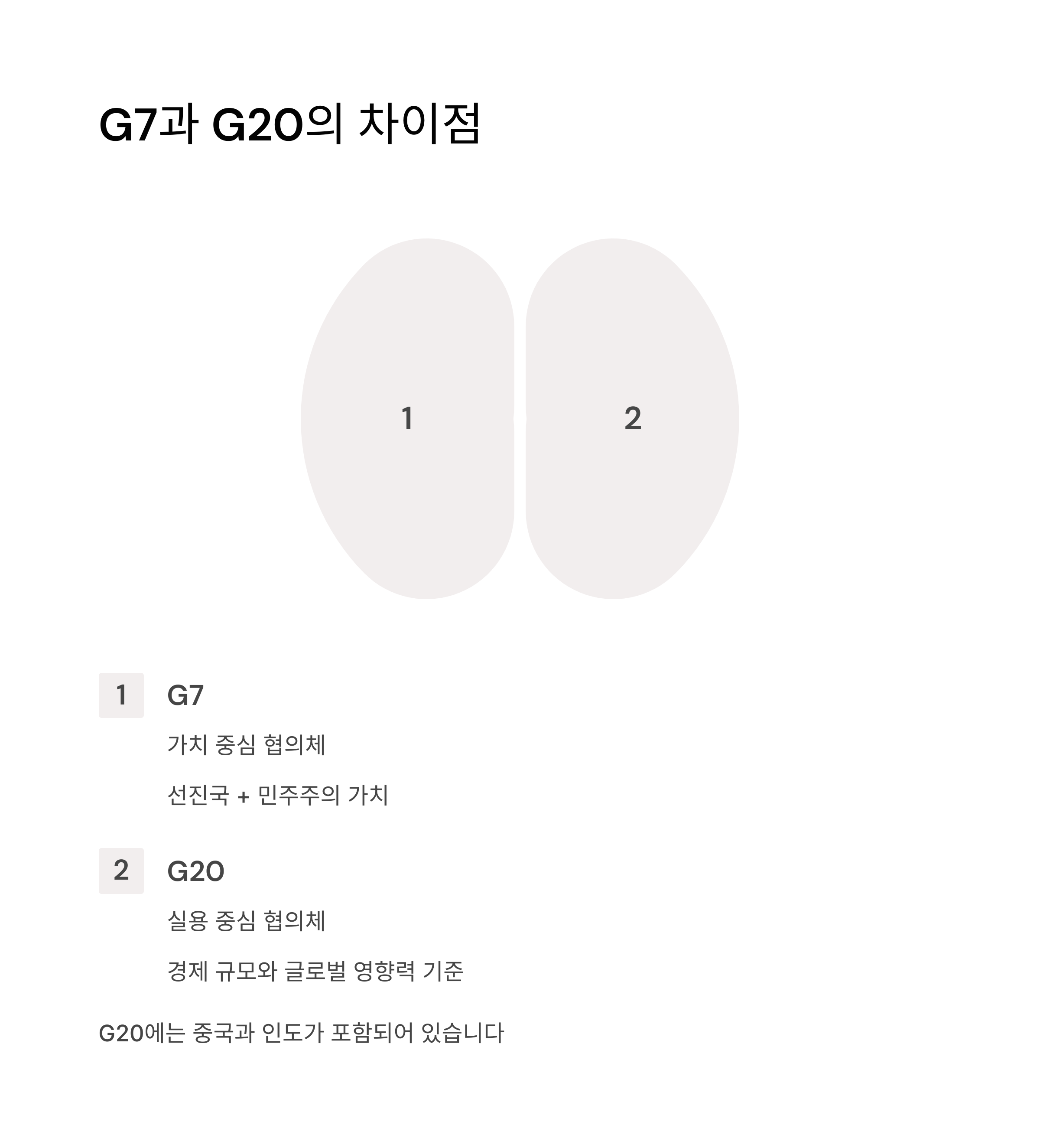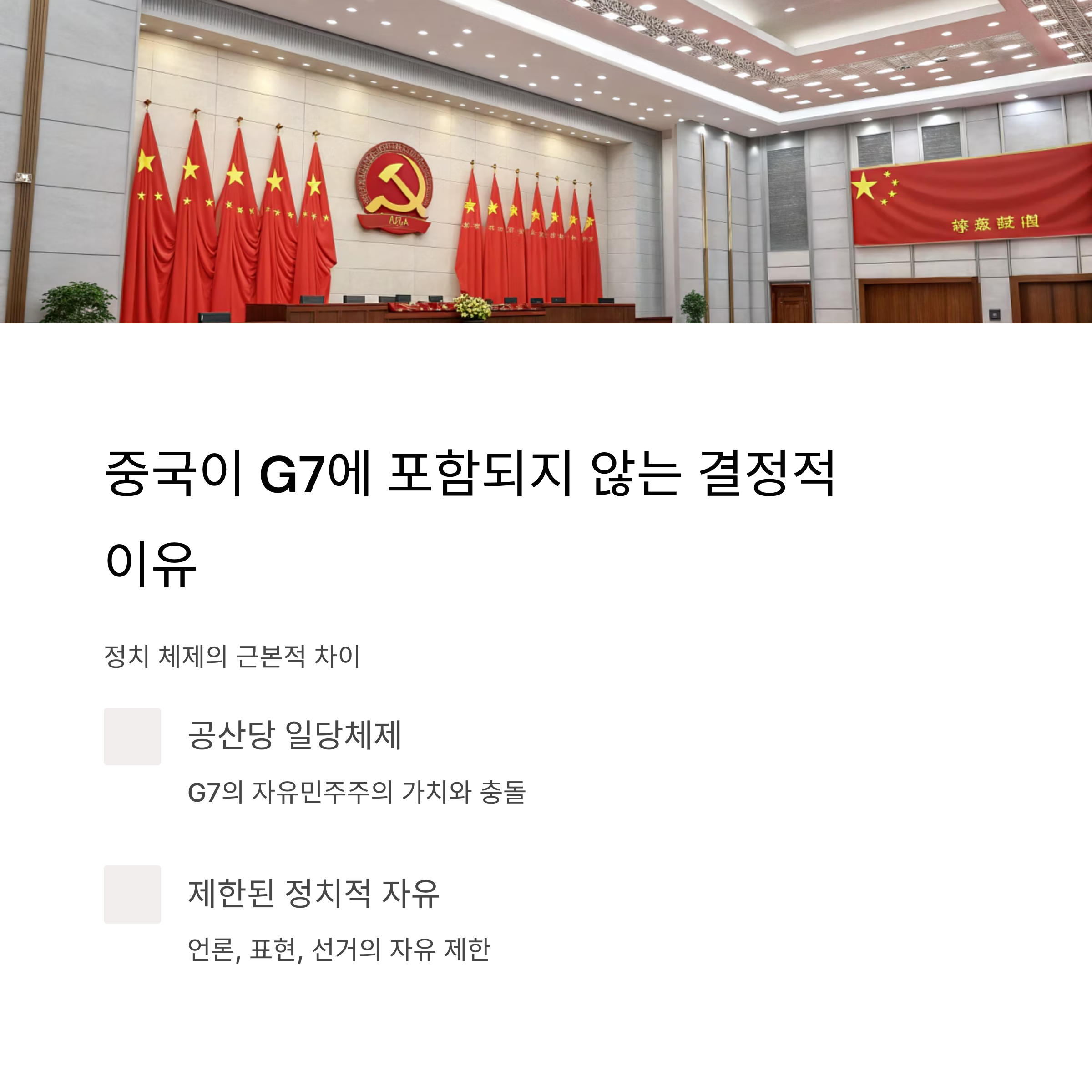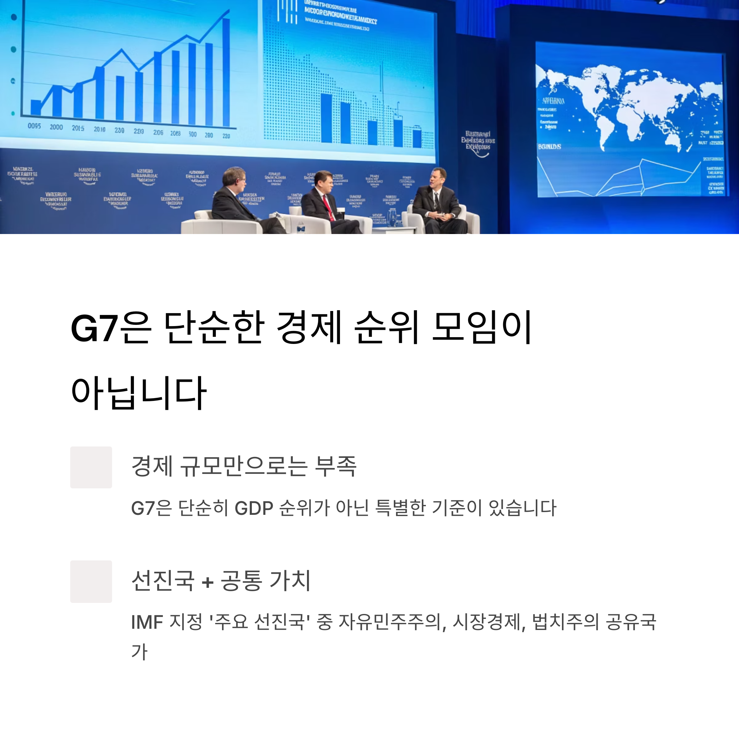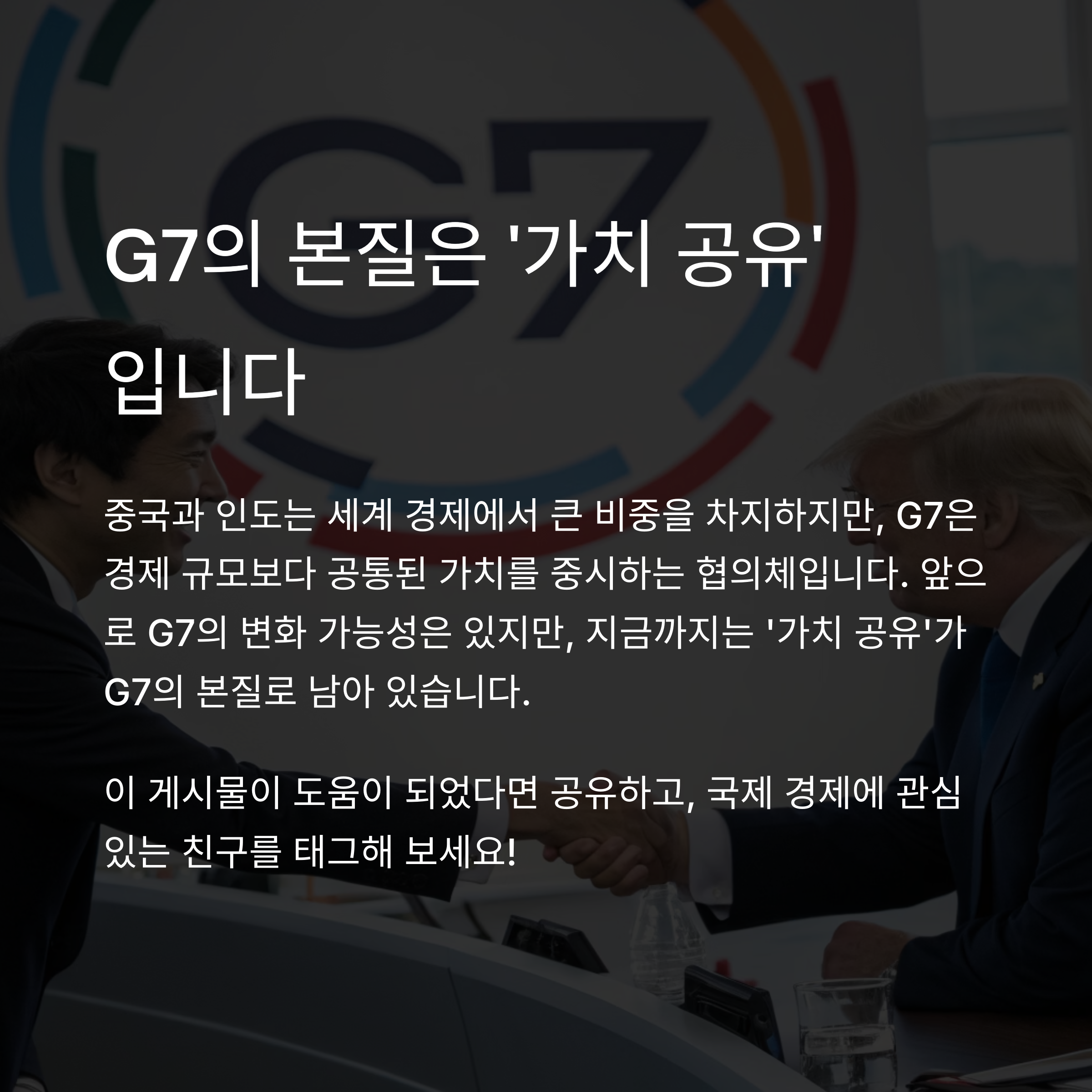 **G7은 민주주의와 선진국 기준이라는 '가치 중심 협의체'**입니다.