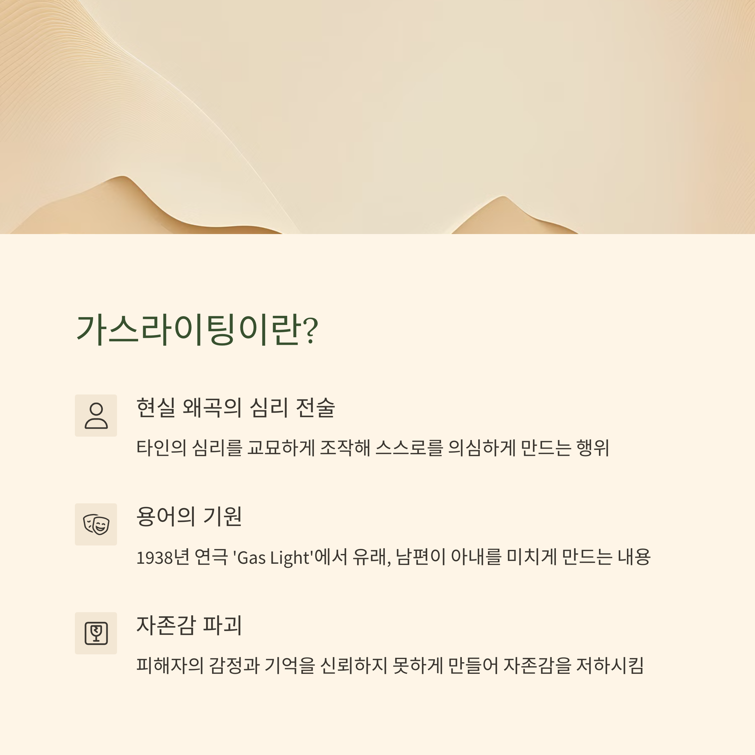 가스라이팅(Gaslighting)은 타인의 심리나 상황을 교묘하게 조작해 그 사람이 스스로를 의심하게 만듦으로써 현실감과 판단력을 잃게 하고, 타인에 대한 지배력을 강화하는 행위를 말합니다. 이 용어는 1938년 패트릭 해밀턴의 연극 'Gas Light'에서 유래되었으며, 남편이 아내를 미치게 만들기 위해 가스등을 조금씩 어둡게 하면서도 아무 일도 없다고 부인하는 내용을 담고 있습니다.