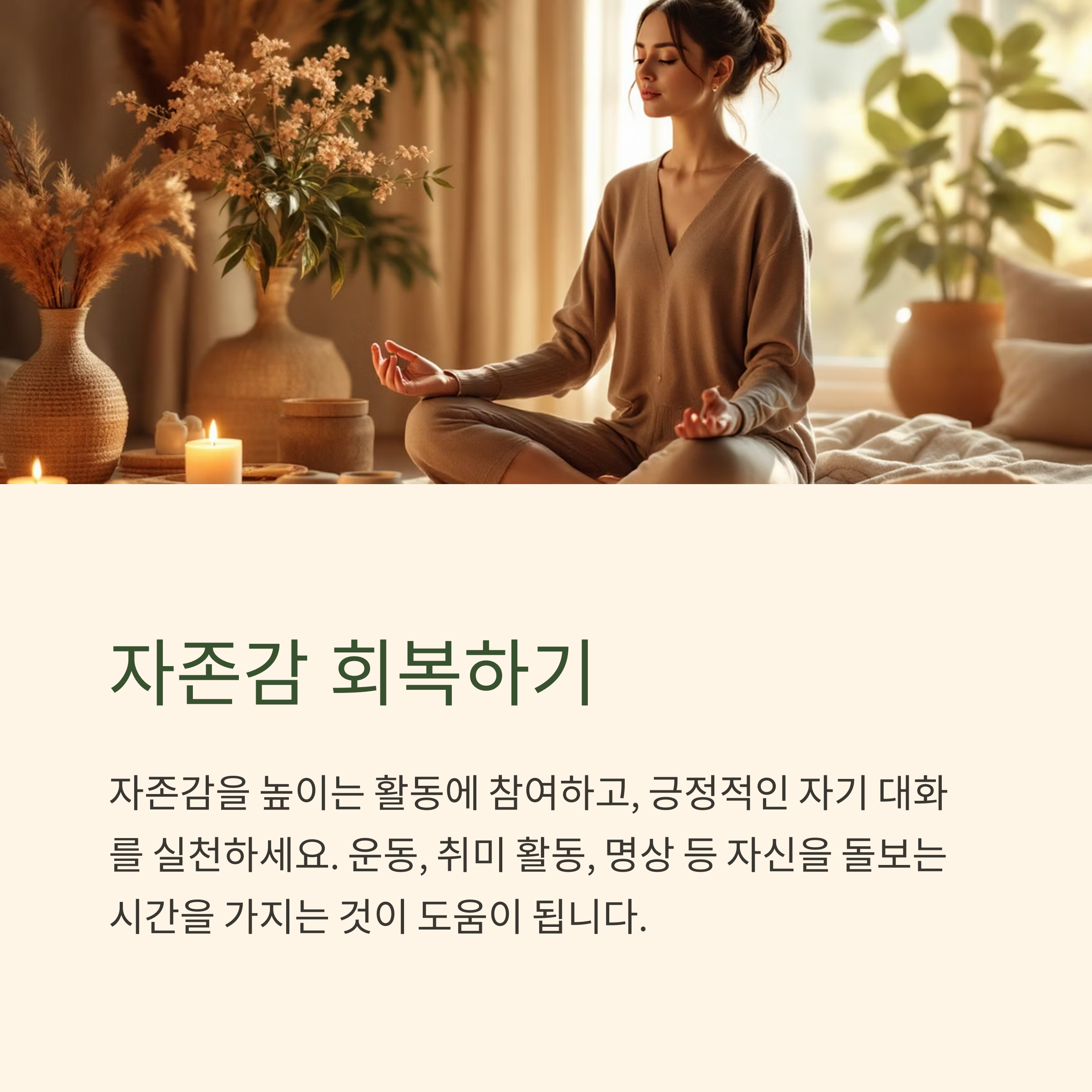 자존감을 높이는 활동에 참여하고, 긍정적인 자기 대화를 실천하세요. 운동, 취미 활동, 명상 등 자신을 돌보는 시간을 가지는 것이 도움이 됩니다.
