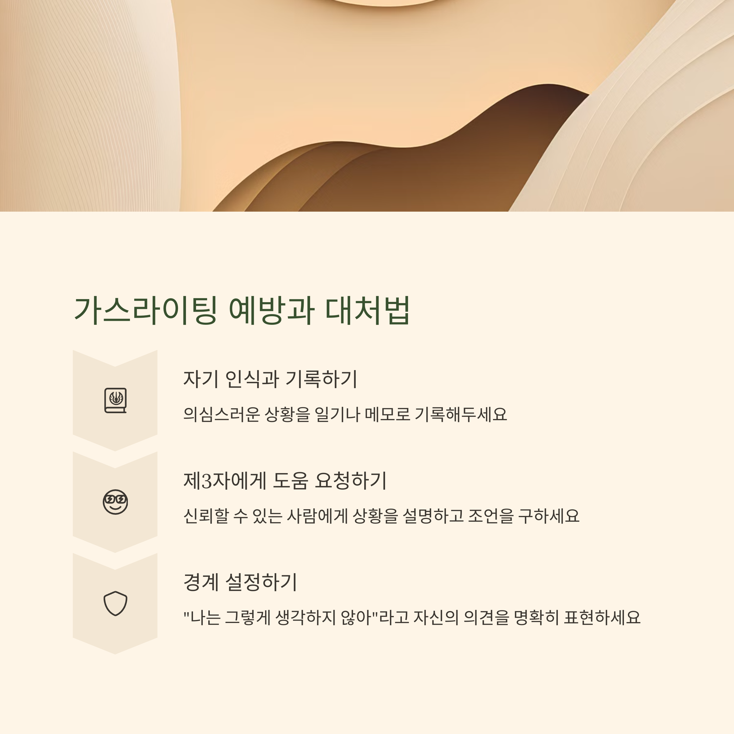 가스라이팅은 학대의 한 형태이며, 누구도 이러한 심리적 조작을 받을 이유가 없습니다. 자신의 직관과 판단을 믿고, 건강한 자존감을 지키는 것이 가스라이팅에서 벗어나는 첫 걸음임을 기억하세요.