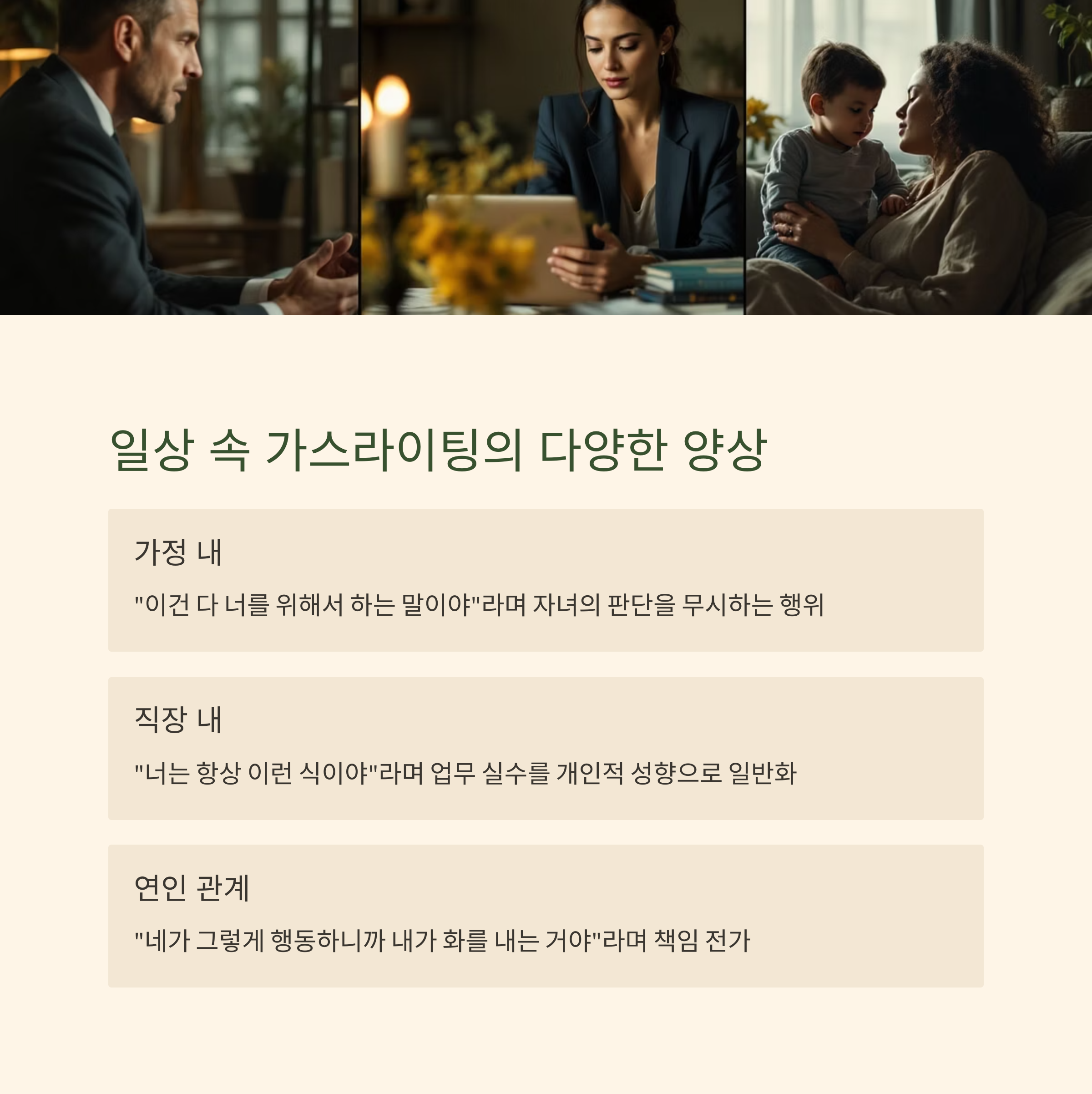 가정, 직장, 연인 관계 등에서 다양하게 나타납니다.