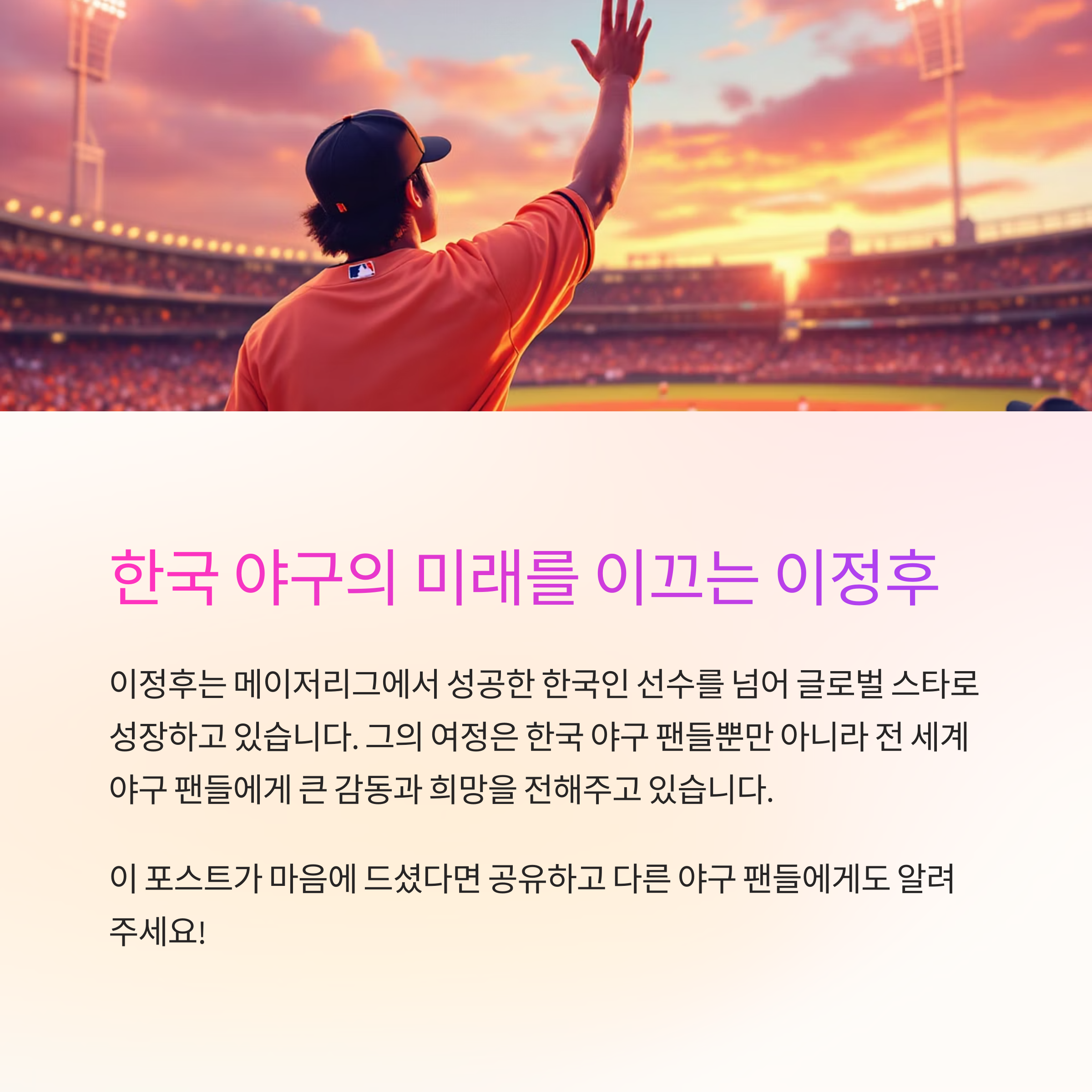 성실한 자세와 기술적 탁월함으로 글로벌 스타가 된 이정후는 앞으로도 팀을 이끄는 핵심 선수로 활약할 것으로 기대됩니다. 그의 여정은 세계 야구 팬들에게 희망이 되고 있습니다.