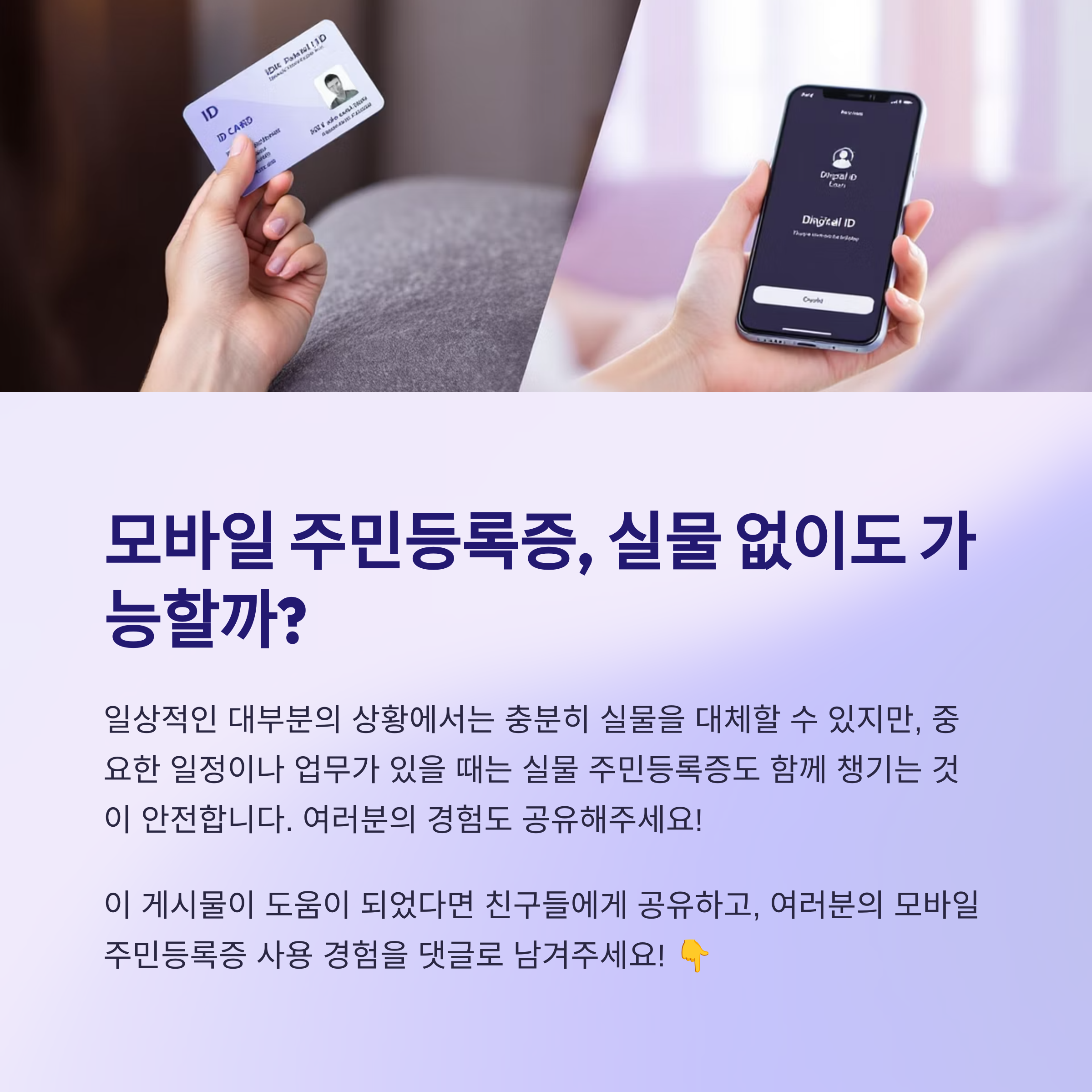 한 달간의 사용 경험을 종합해볼 때, 모바일 주민등록증은 일상적인 대부분의 상황에서 실물 주민등록증을 대체할 수 있습니다. 특히 자주 사용하는 편의점, 주민센터, 병원 등에서는 매우 편리하게 사용할 수 있었습니다. 그러나 아직 모든 기관이 모바일 주민등록증을 100퍼센트 수용하는 것은 아니므로, 중요한 일정이나 업무가 있을 때는 실물 주민등록증도 함께 챙기는 것이 안전합니다. 또한 해외여행 시에는 여전히 실물 신분증이나 여권이 필요하다는 점도 기억해야 합니다. 디지털 전환 시대에 모바일 주민등록증은 분명 편리함을 더해주는 혁신적인 서비스입니다. 앞으로 더 많은 기관과 서비스가 모바일 주민등록증을 수용하게 되면, 실물 주민등록증 없이도 모든 상황에서 사용할 수 있는 날이 곧 올 것으로 기대됩니다. 마지막으로, 모바일 주민등록증은 발급 방식에 따라 장단점이 있으니 자신의 상황에 맞게 선택하는 것이 좋습니다. 자주 휴대폰을 교체하는 분이라면 IC주민등록증 방식을, 비용을 아끼고 싶다면 QR발급 방식을 추천합니다. 이처럼 모바일 주민등록증은 우리의 일상을 더욱 편리하게 만들어주는 혁신적인 서비스입니다. 아직 100퍼센트 완벽하지는 않지만, 기술의 발전과 함께 계속해서 개선될 것으로 기대됩니다.