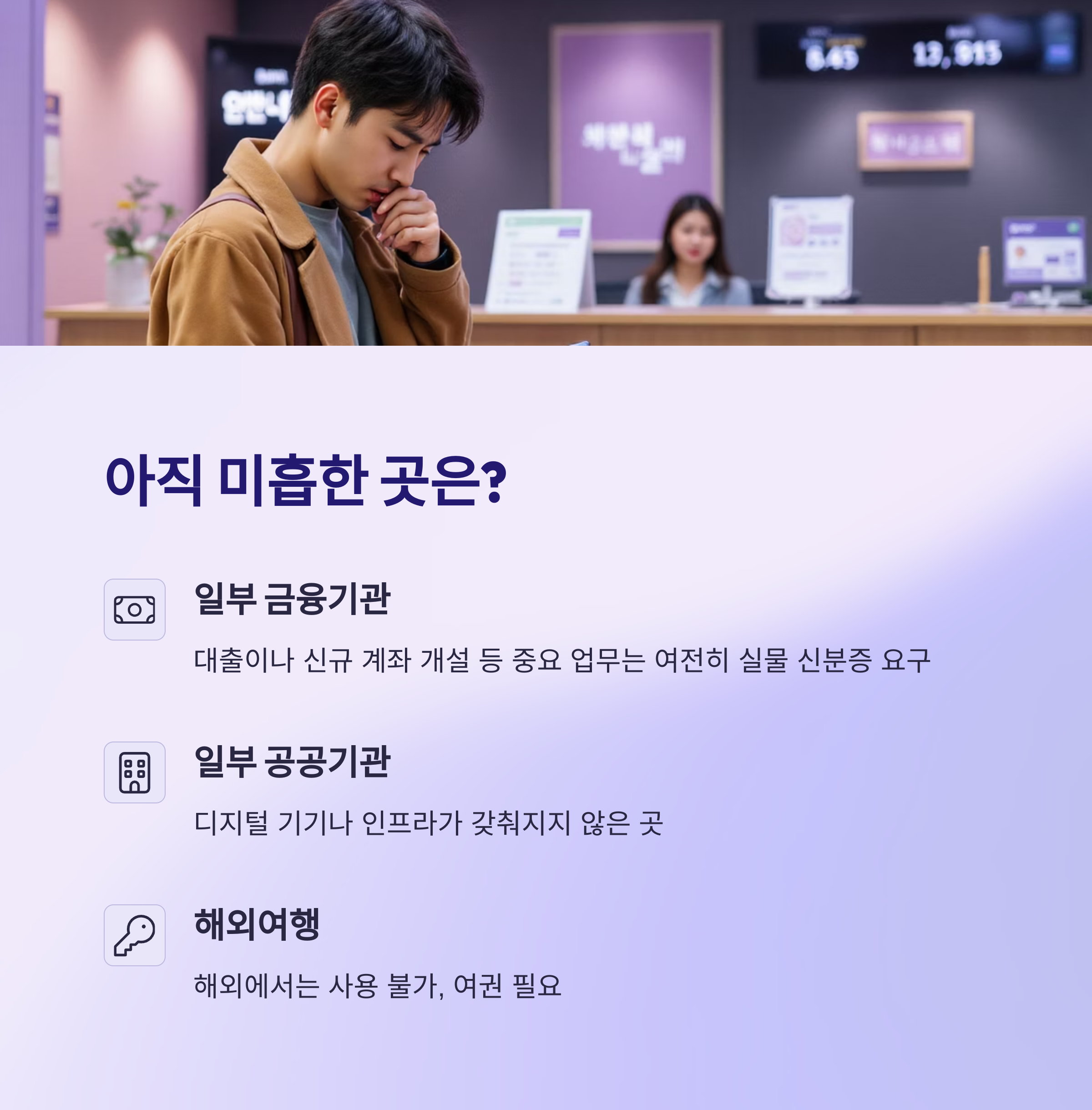 - 일부 금융기관: 대출이나 신규 계좌 개설 등 중요 업무는 여전히 실물 신분증 요구