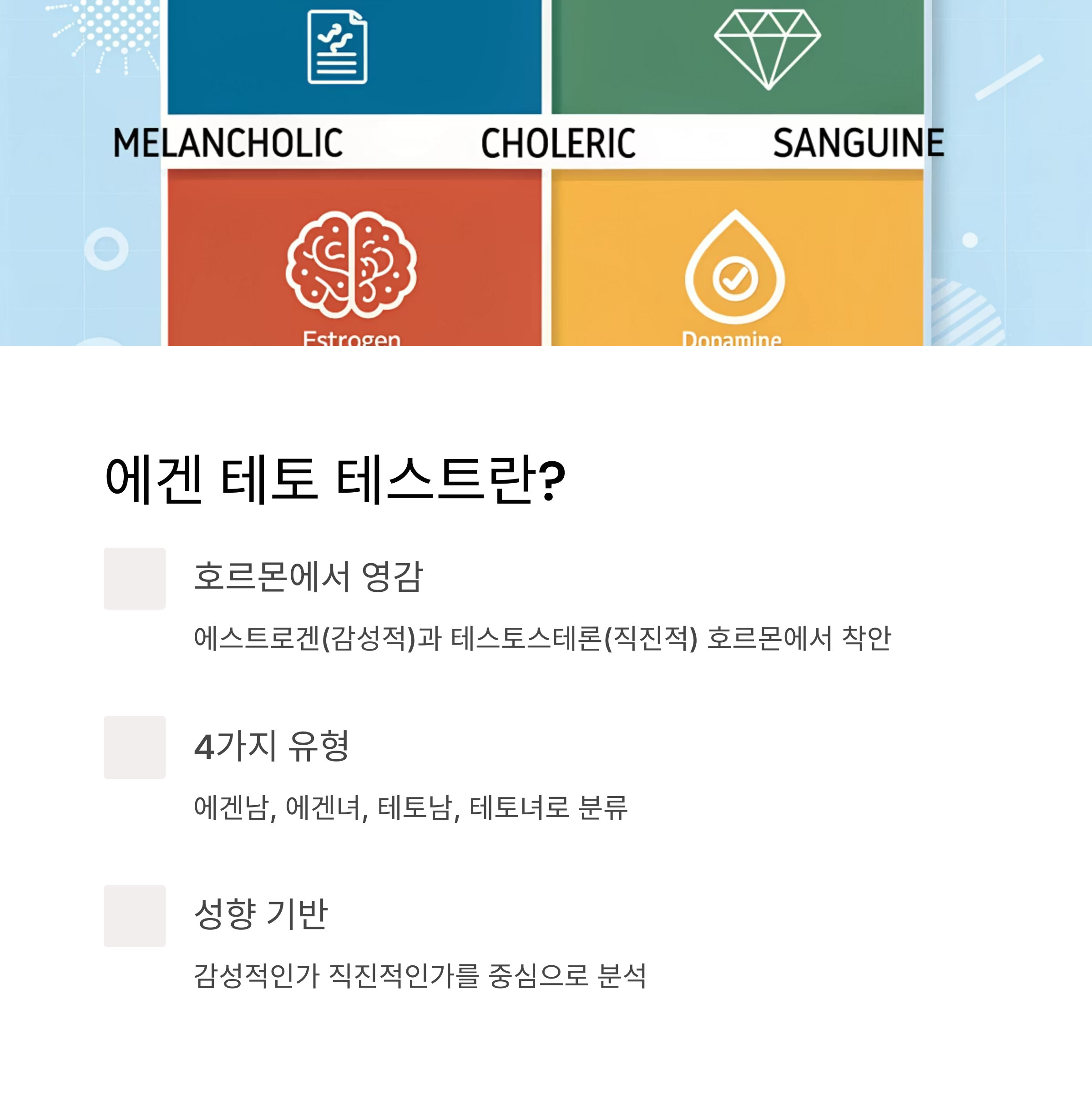 자기 성향 테스트입니다. 에스트로겐에서 유래된 '에겐'은 감성적이고 섬세한 성향,