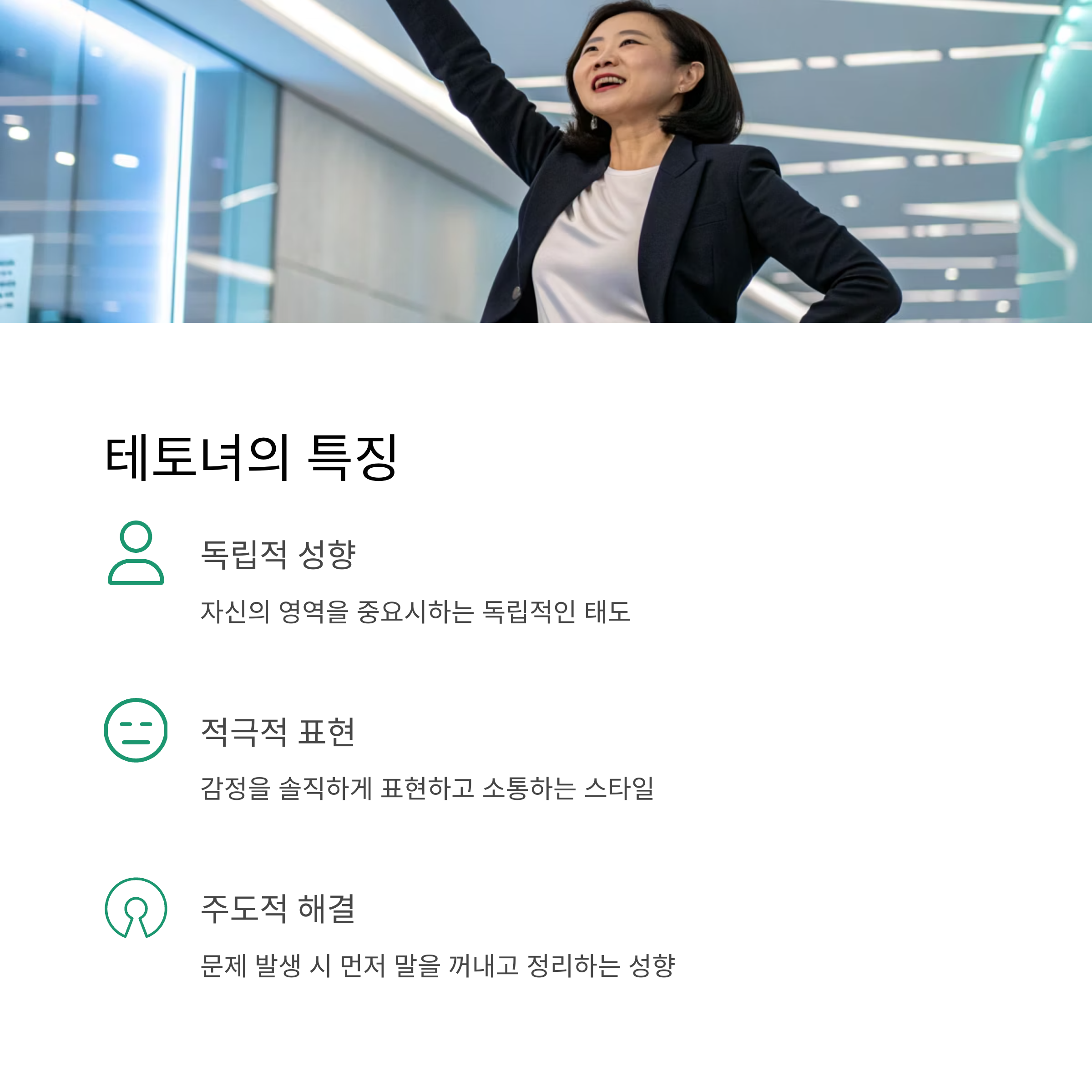 | 테토녀 | 감정 표현 적극적, 독립성 강조 | 먼저 말 꺼내고 정리하는 성향 |