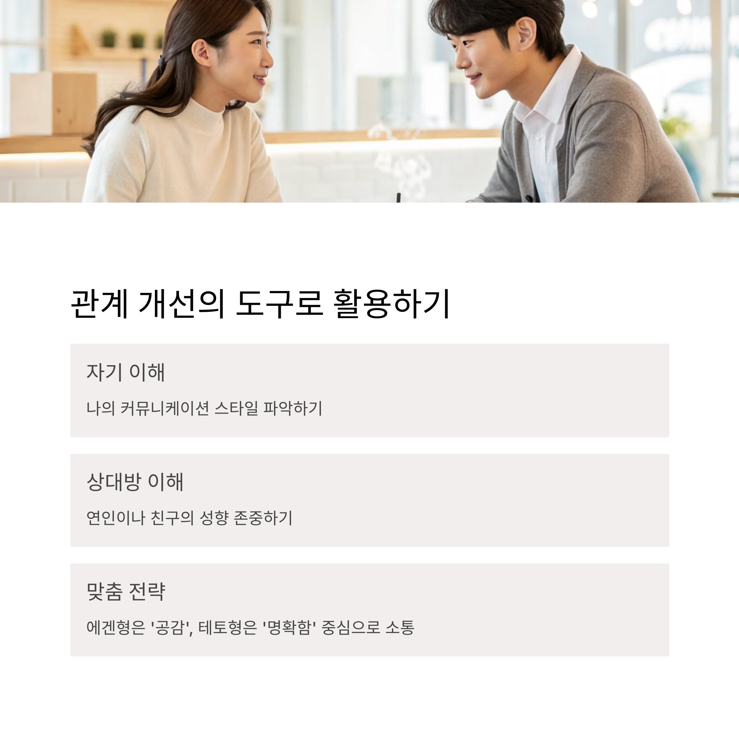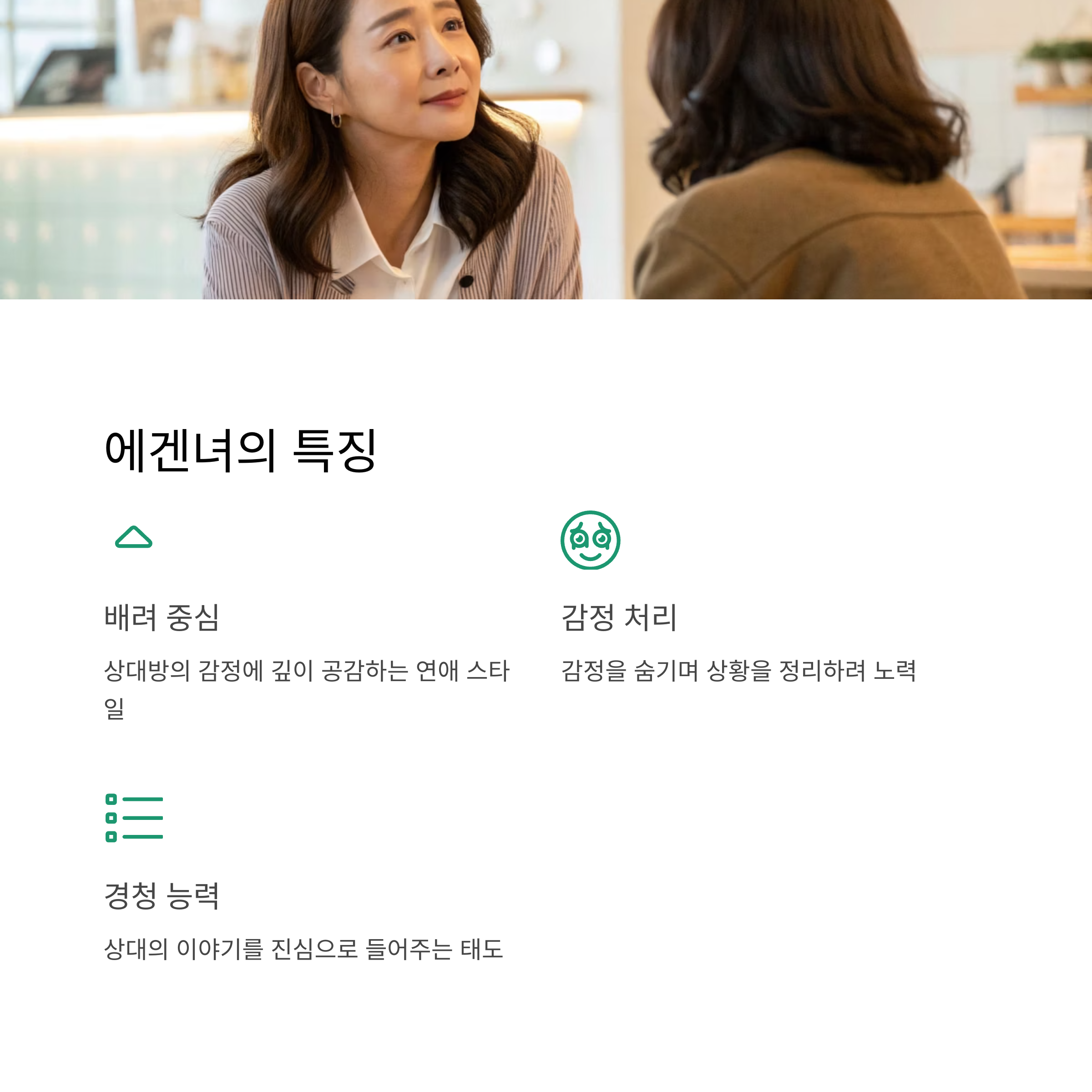 | 에겐녀 | 배려 중심, 상대 감정에 공감 | 감정 숨기며 상황 정리 시도 |