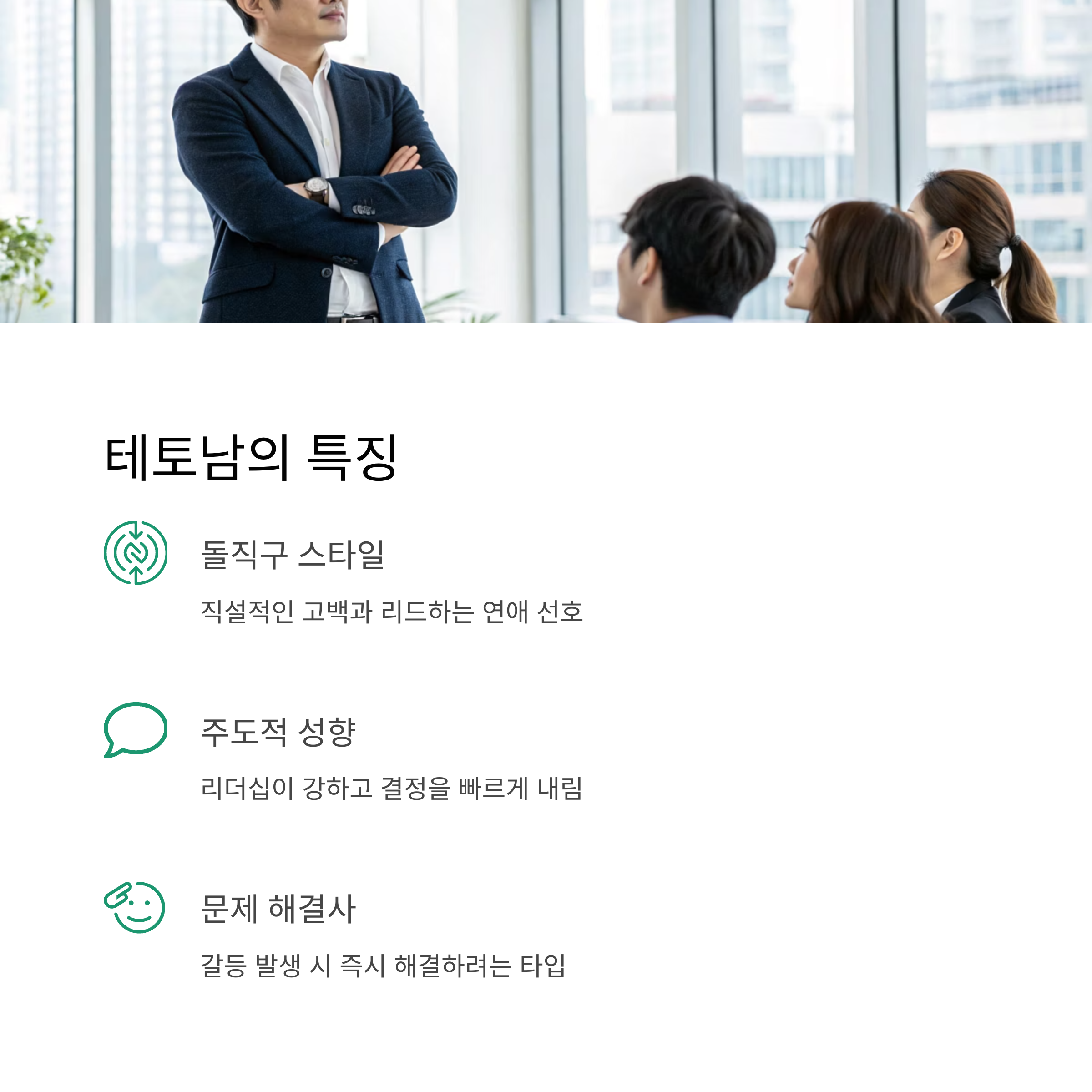 | 테토남 | 돌직구 고백, 리드하는 연애 선호 | 즉시 해결하려는 타입 |
