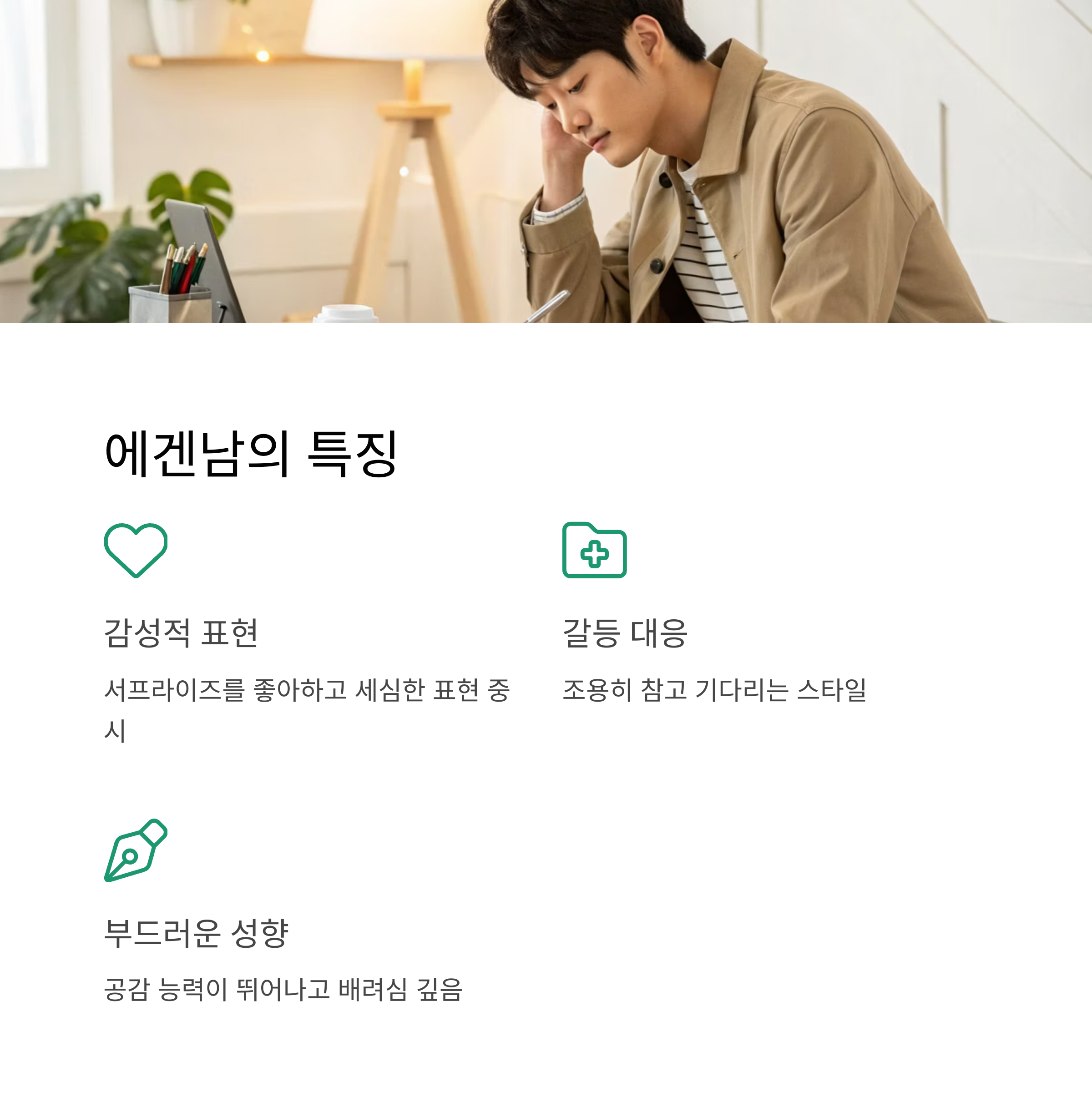 | 에겐남 | 서프라이즈 좋아하고 세심한 표현 중시 | 조용히 참고 기다리는 스타일 |